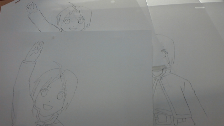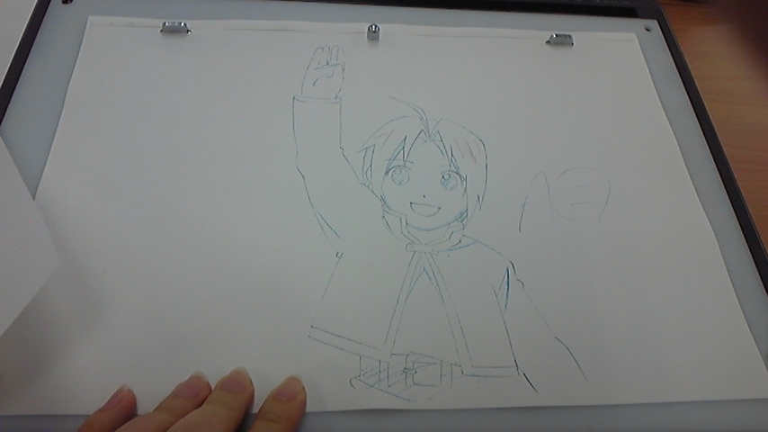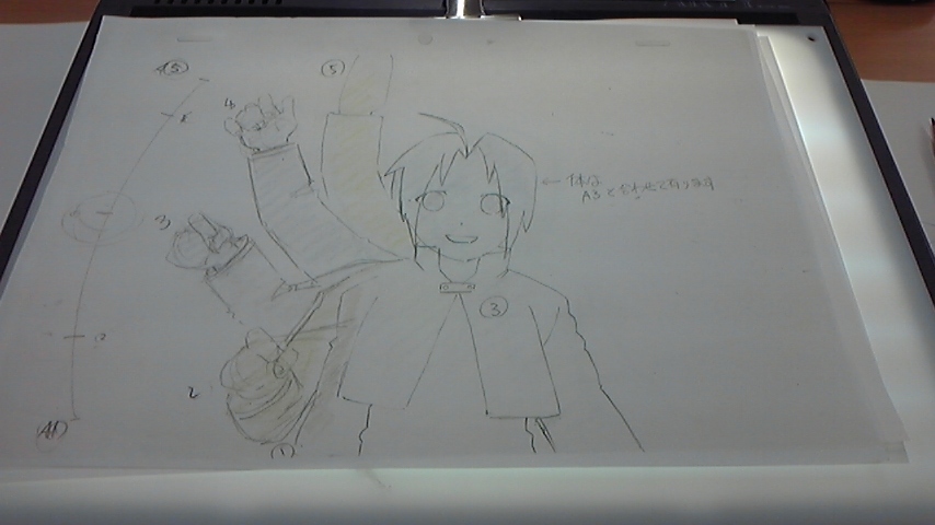 久しぶりにゼミの東京コミュニケーションアート専門学校に行って来た犬塚ですばんわー!! 前回は「漫画」でしたが今回は「アニメ」です!んで、アニメの中でも、作画と呼ばれてるキャラクターの動きを何枚も何枚も描いてそれを連続してみると動いて見えるってヤツですねっ!!ディズ●ーもジ●リも当たり前のようにやっている作業です。 ・今回はこれ~!ハガレンのエドっぽい人の手を上げ下げする動作を描いていきます。ちなみに先生はこの道、30年の超ベテラン先生でっす!「名探偵コナン」や「グレンラガン」「D.Grayman」などの数々の作画を手がけてらっしゃいます!!!! ・大体こんな感じの動きで5枚描いていくわけですね~。 ・服のシワや口をちょっとずつ開けていく、頭を右に傾けるなどなど…。むむむ難しいずぇ~…!そんなかんなで5枚完成!! ・この機械とパソコンとカメラで一枚一枚取り込み、パラパラ動画が見れるわけでっすね!ウィンドウの中にエドが映ってるでしょう?? 完成品がこちら!!動画なので上手くうpできるか分からないけれど!! と思ったら… 容量が大き過ぎてうp出来ない…だと…!?? ちょうごめんなさいorz でも、犬塚は自分の絵が動いてあまりの嬉しさにテンションが駄々上がりでしたよッ!!とにかくすごかった!正直自分で上手く出来たと自負しているッ!あまりにも見たいときはコメントに残してね!メールで送っちゃいますから!! 次回は「アニメ」で何をやるんでしょう♪ 楽しみですww