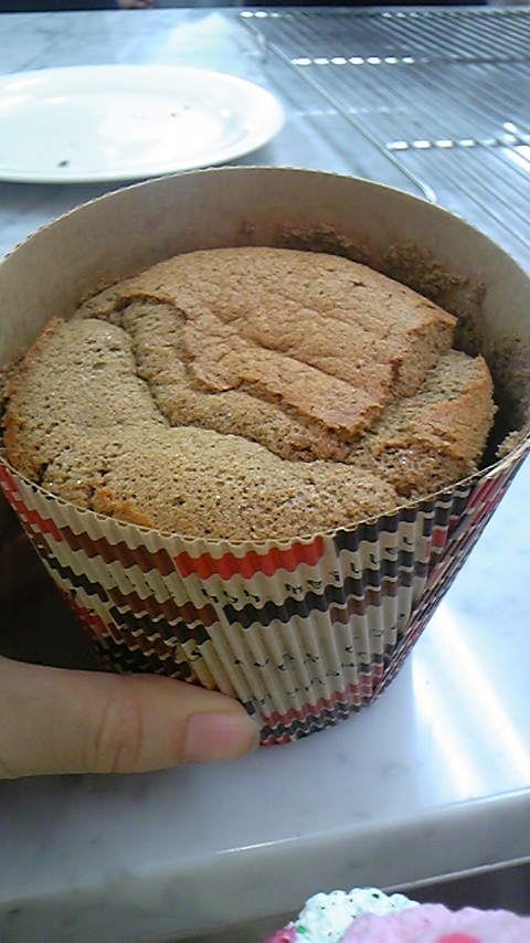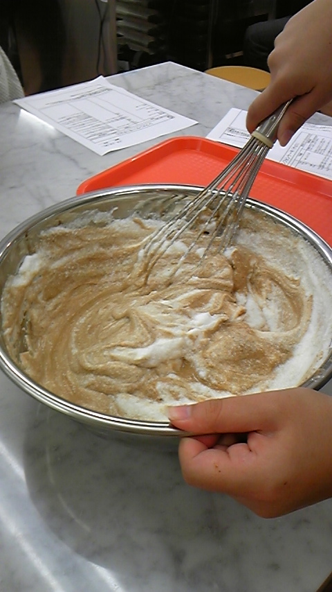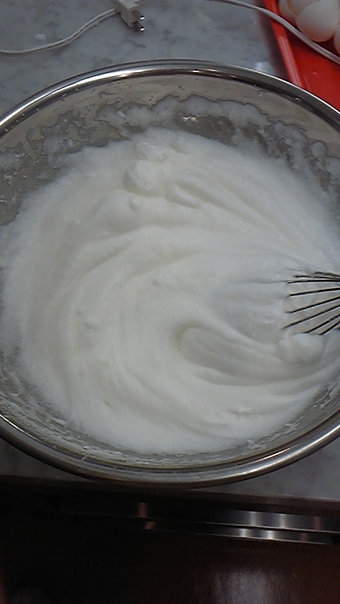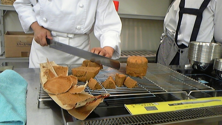 ばんわ~ツイッター始めてからというもの毎日携帯の充電しなくちゃ駄目って位つぶやいてる犬塚ですばんわー!!だって楚良(bot)がッ!楚良(bot)がぁぁぁああ!! まぁ、その話は置いといて~ 2日目の今回のお題は………シフォンケーキでっす! 昨日とレヴェルの差が段違いじゃねぇかぁぁぁあああああああ!!! 果たして犬塚は無事「しふぉんけぇき」を作ることが出来るのか!? ・こんなに材料が必要なんですねぇ…。ちなみにチョコ味ですw粉がいっぱいあって区別がまるでつきません(笑えない)黄色い液体も、白身とサラダ油の2種類ありますが、うっかり間違えそうです(笑えない) ・生まれて初めて電動ホイッパーを使いました。しかも家庭用じゃない超強力改造版!!先生も昔ぶちまけたらしいという…ぶっちゃけ見てるだけで恐ろしかった…orz写メはメレンゲ作り中のもの。 ・卵黄と上白糖と粉類とチョコレートを乳化したものの中に少しずつメレンゲを加えていきます。メレンゲの泡を潰さない様に(何故かって言うとこの泡でケーキを膨らますからです)大雑把に、しかも手早く混ぜていきます。綺麗なマーブル模様でっすねっ★ ここら辺、写メを撮り忘れて全く工程が分かりませんw とにかく完成♪ 完成品はお持ち帰りということで、先生が作ってくれた試作品を頂きます!! ・なっがい包丁ですね~ しかもうちのスタッフは優秀で、一番に作り終えたばかりか、後片付けまで完璧という…ッ!なんて有能なの! ・家に持ち帰った完成品でっす!お味は…「流石ッ!!」って感じでした!ふわっふわっ!!しっとり! 次回はスコーンだそうです!なんか難易度上がってね?って感じですが!!某パブってGO!の人を思い出しますね★殺人兵器にならないように…頑張ろう…!