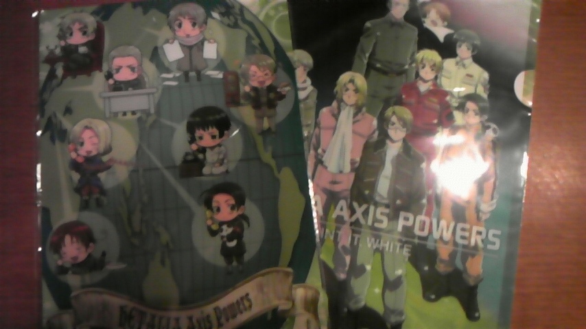 いつも行く本屋さんの店員さんのお姉さんが銀幕ヘタリアに行ったみたいなんですが、まぁすっかり顔見知りになっちゃって♪お土産でファイルと下敷きくれたんですよ~♪♪↑↑貰えた事よりもその心意気がうちにとっては嬉しいですw