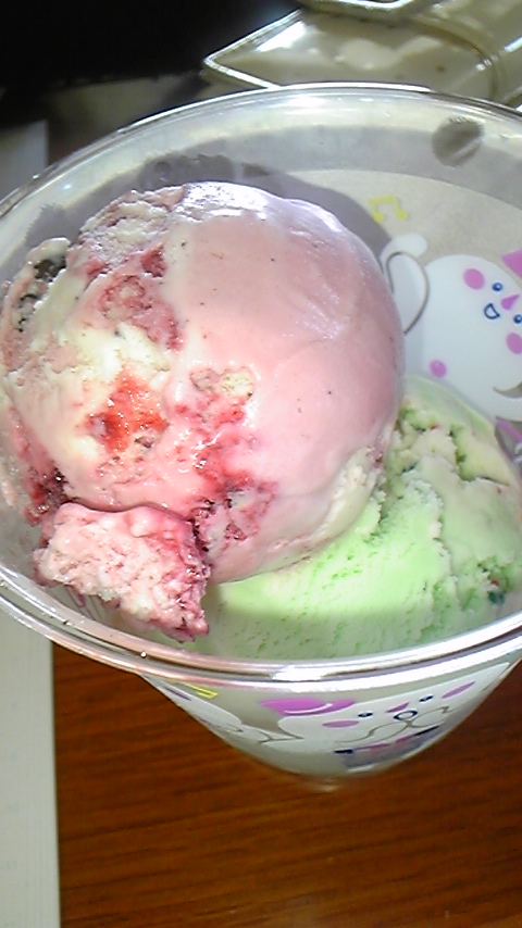 写メはさちの雪だるまセット。手前のがラブポーションサーティーワンで、緑色のがポッピングシャワーでっす★ちなみに犬塚がポッピングシャワーを食べると口ん中が「いってぇぇぇぇ」となるので苦手です。
