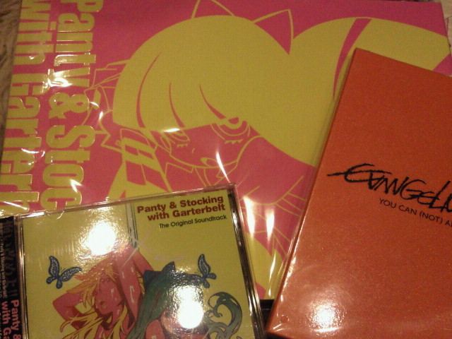 パンティ&ストッキングwithガーターベルトの! 設定資料集と! オリジナルサントラと! エヴァンゲリヲン新劇場版:破のDVDですよ! ひゃっほぉぉぉおおぉぉおう!!テンションMaxな犬塚です!あ、いつものことか…。 設定資料集は見た目もピンクと黄色で大変お洒落ですw 中身はパンティやストッキングの細かい服装指定やキャラの各設定などなど…。残念なことに逆作画崩壊の絵柄は載っていませんでした~…↓↓でもスキャンティとブリーファスのページを狂ったように何度も何度もっていうかずっと見てても飽きないです。大真面目。 オリジナルサントラも総て英語の曲と歌詞なのでさながら外国のCDのよう! 見た目も超格好良い!!やっぱり一押しはパンスト変身シーンと悪魔姉妹変身シーンの曲でしょうか。OP&EDのfullも必聴です!! ちなみにエヴァの特典フィルムはアスカでした!使徒とか碇指令じゃなくてよかった…本当に安堵。