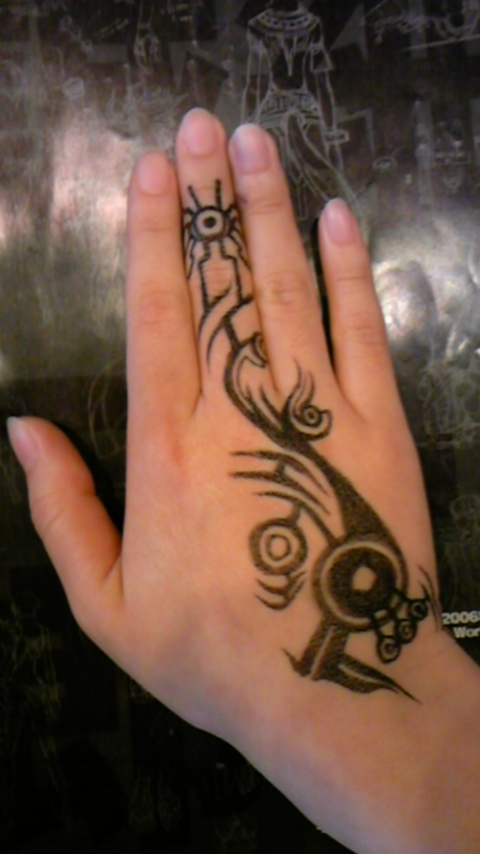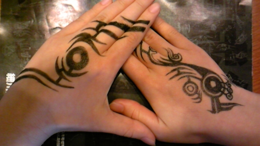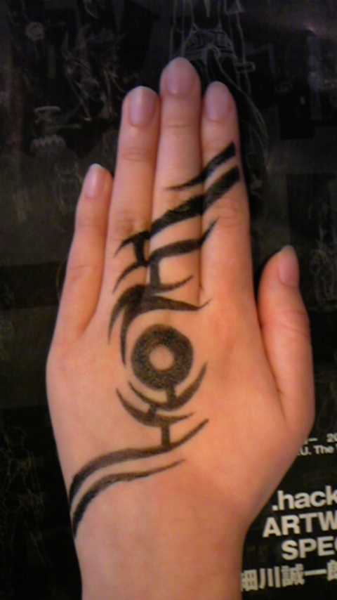 思わずいれちゃいました~…なんて筆ペンでお絵かきな犬塚ですばんわー! さちがうちの手に描いてくれました~!左手はハセヲのお腹の刺青っす! 右手はG,U,風にさちの創作です。なんでも出来ちゃうね☆困ったもんだ☆(泣) 両手はこんな感じ!格好良いゼ…(キラキラ) しかしこの後、手を洗ってもなかなか落ちなくて、色素が薄くなって、ガチで刺青いれてるみたいになってしまった…。皆も気をつけよう☆